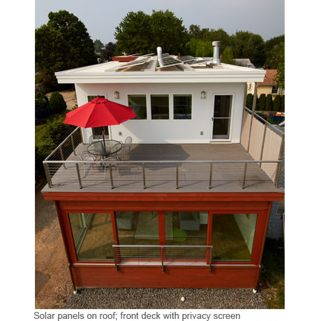 For a new home on a narrow lot on the Westport waterfront, taking in as much of the great view as possible is paramount. But the windy, wet, corrosive environment also demands low-maintenance materials and tight, energy-efficient construction. All that and more come together in this compact two-level contemporary. The top floor contains a master suite with doors that open onto a balcony deck with direct water views. There’s also an artist’s studio and full bath. Downstairs, a great room contains living and dining areas and a kitchen with black walnut cabinets, and there are also two bedrooms, a TV room, a laundry room, a full bath and a powder room. For maximum energy-efficiency, the entire exterior shell—roof, walls and bottom floor—was shot with a thick layer of foam insulation. In such a tight structure, a heat-recovery ventilation system maintains indoor air quality without wasting heating or cooling energy. And for a measure of cost-effective energy independence, a five-kilowatt rooftop solar panel system provides more than half of the house’s electrical needs.